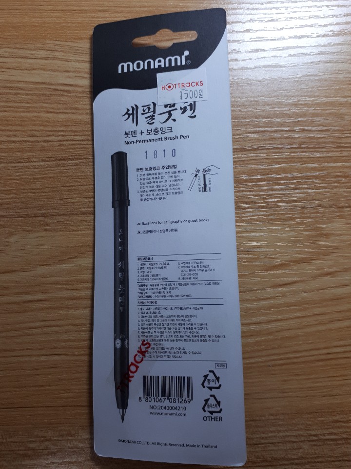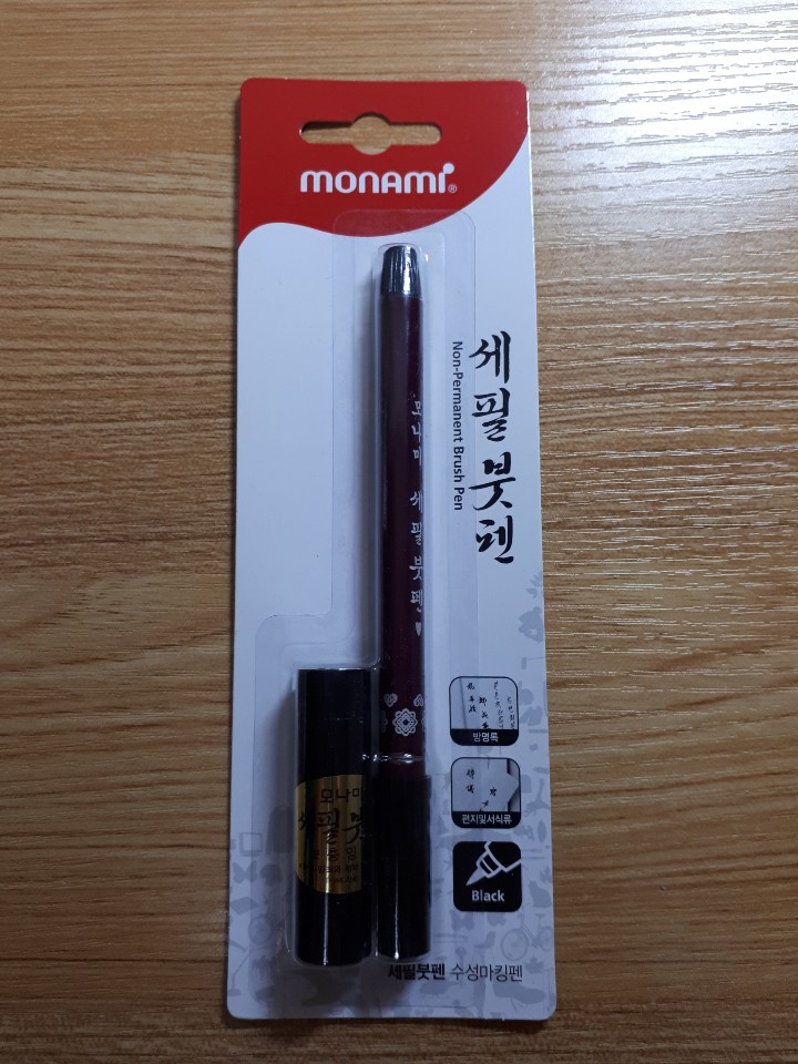 모나미 붓 펜이 큰 것(2,000원)과 작은 것(1,500원)이 있고, 더 값나가는 붓 펜들도 있지만 연습용으로 쓰기 위해 제일 저렴한 것으로 사서 해봤는데 나름 괜찮습니다.