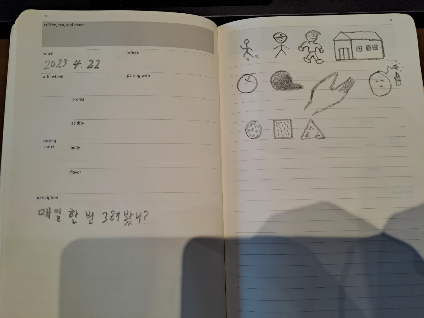 2023년 4월 22일(토)에 들고다니기 편한 노트에 그림을 한 번 그려봤습니다.