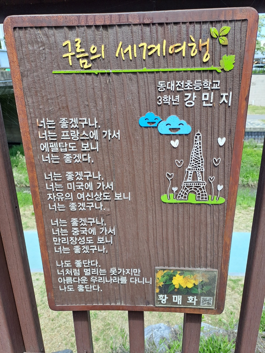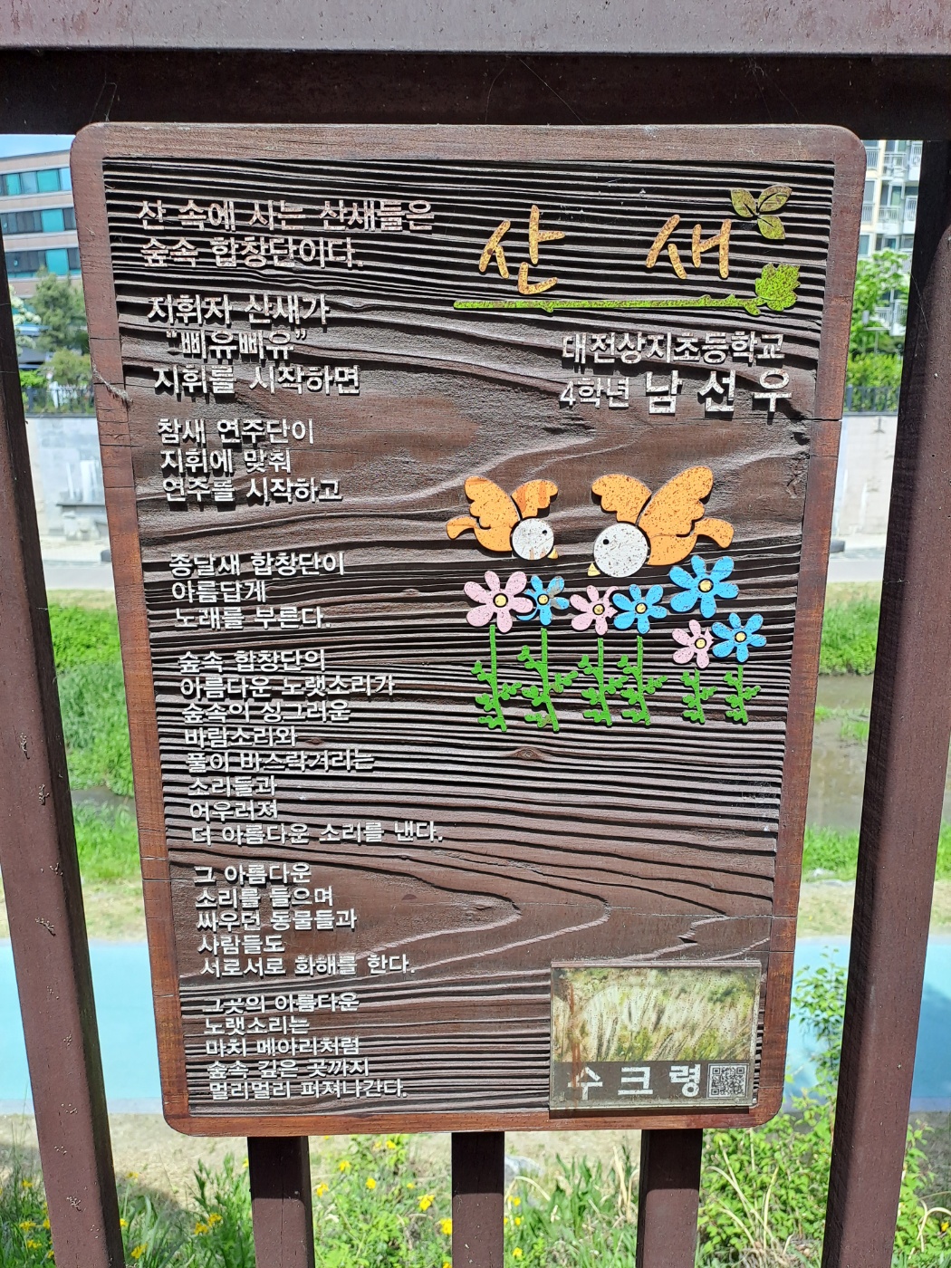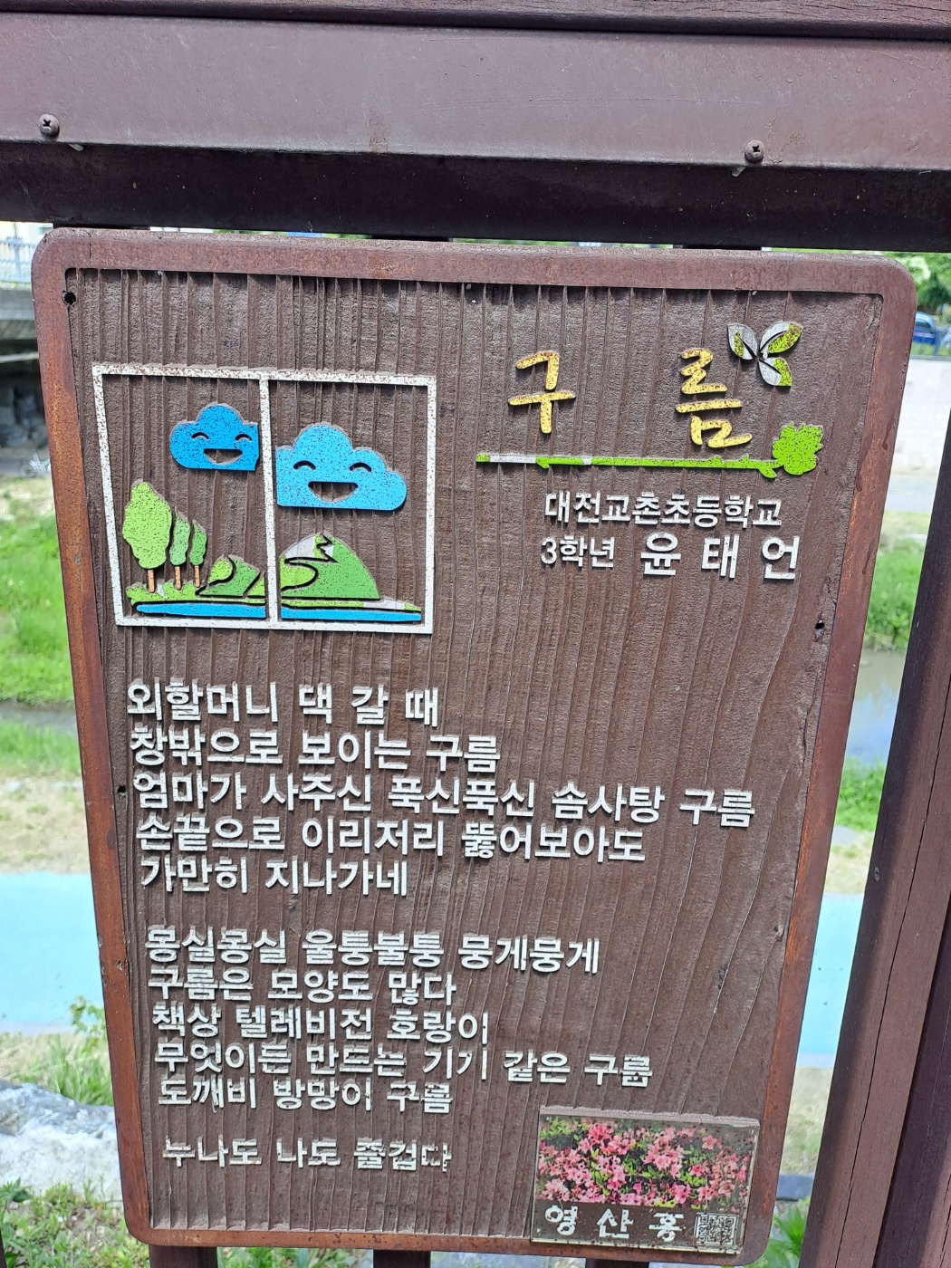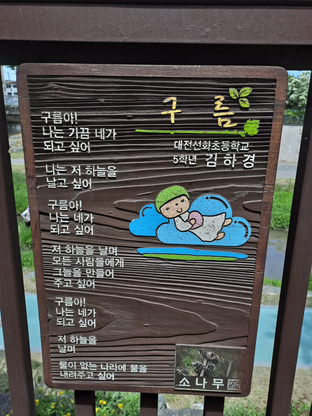어제 산책을 하다가 평소에 대충 흘겨보던 것에 갑자기 관심을 갖게 되었습니다. 바로 산책길에 있는 시(詩/Poem)입니다. 평소에 여러 산책로를 걷는데 주로 서점을 향해 걷습니다. 그러다가 다양한 초등학교의 학생들이 쓴 시들을 보았습니다. 선생님께서 주제를 정해주셨는지 그에 맞춰 쓴 시들이 전시되어 있었습니다. 예를 들면 학교나, 학년은 다르지만 구름, 산새, 소나무와 같은 제목으로 시가 쓰여있었습니다. 그러다가 최승호를 발견했습니다. 저는 대전에 이런 영재 시인이 있다는 것에 자랑스러움을 느꼈고, 역시 대전은 노잼도시가 아니라는 것에 확신을 하며 설레는 마음으로 오늘 최승호 찾기(Feat. 김종욱 찾기)를 해보기로 하였습니다.