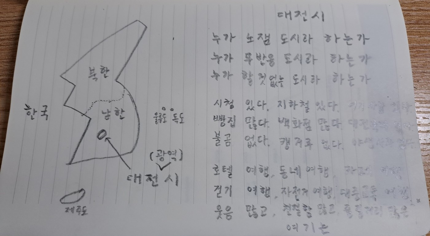 그래서 오늘은 시를 그려봐야 겠다고 생각했습니다. 하지만 시를 그리려 하니 바로 떠오르는 그림은 없고 한자가 우선 생각이 났습니다. 그래서 저는 대전 시 를 그리고 썼습니다.