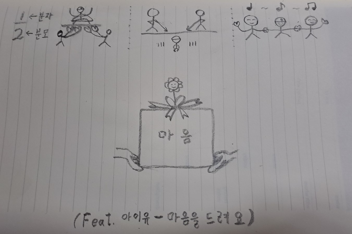 어렸을 때 이상하게 수학의 분자와 분모가 너무 헷갈렸습니다. 그래서 저는 이렇게 외웠습니다. '감사하게도 부모님께서 사랑으로 자식을 떠받쳐 주신다.' 그래서 아래의 그림을 그리게 되었습니다.