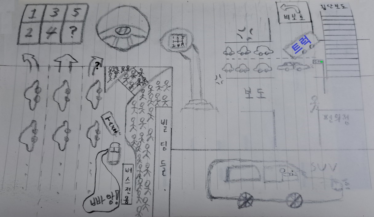 한 번은 제 친구가 운전하는 차에서 조수석에 앉아 있었습니다. 버스정류장으로 다가갈 때 앞쪽에 사람이 손을 흔들어 택시를 잡는 모습이 보였습니다. 그리고 그림의 왼쪽 아래처럼 택시가 우리 차 앞을 막아서는 일이 생겼습니다. 택시는 저렇게 왼쪽으로 들어가지 못하면 손님이 가달라고 하는 방향의 반대 방향으로 가게 되어 손님에게 욕을 먹는 상황이 되니 저렇게 끼어들어 온 것 같습니다.