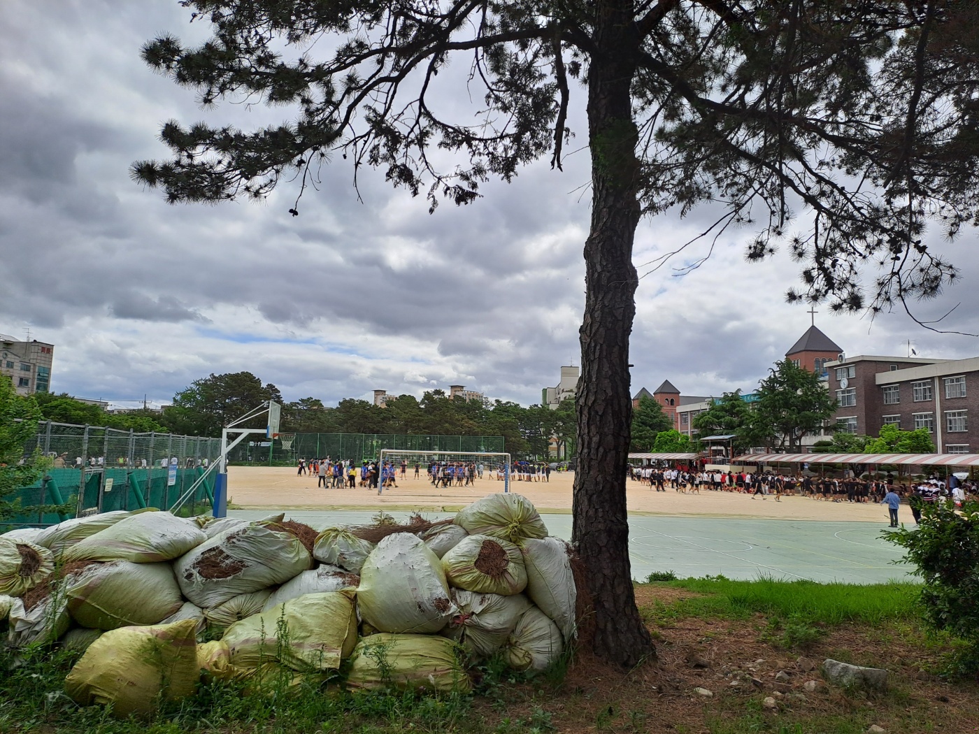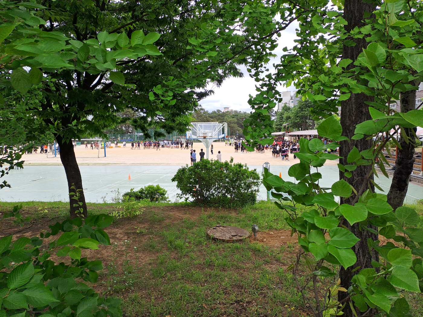 오늘 찍은 사진에 보이듯이 운동장에 계단이 있어서 학생들과 선생님들이 그곳에 앉아서, 서서 응원을 했습니다.