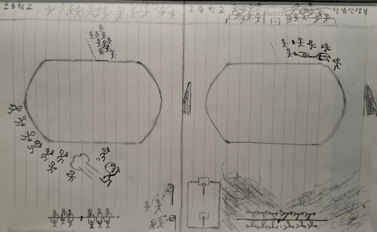 2학년 체육대회 때 그림과 같이 담임선생님께서는 학생들과 같이 계단에 앉아서 응원을 하고 계셨습니다. 저때는 잘해야겠다는 마음 때문인지 체육대회 전날부터 떨렸던 것 같습니다. 드디어 체육대회 마지막 경기로 계주가 시작되었고, 저의 운동장 한 바퀴 달리기가 시작되었습니다. 그런데...