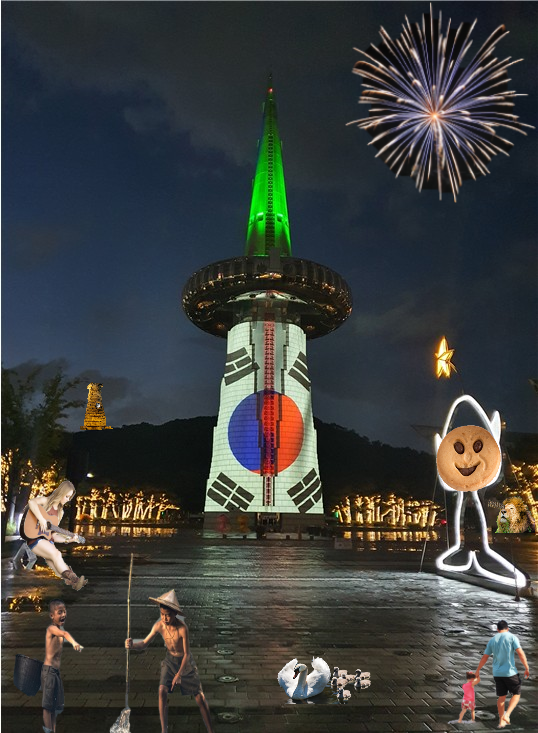 대전의 한빛탑이 빠질 수 없지요. 한빛탑에 위 이미지들을 포함하여 여러 이미지들을 합성해 넣었습니다. 재밌어서 자꾸 합성하다 보니 주제가 피사의 사탑 그리기에서 숨은 그림 찾기가 되었습니다.