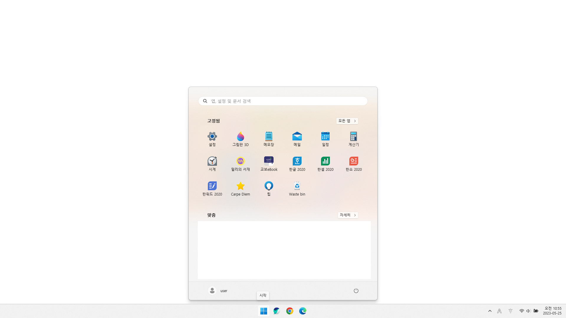 어차피 모든 어플, 파일들은 D드라이브에 저장이 되어있기에 밀리의 서재, 워드, 엑셀, 파워포인트 등 자주 사용하는 어플들만 '시작'에 고정해 놓고 이용합니다.