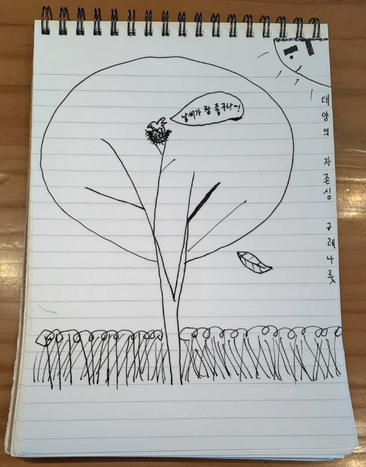 나무가 녹색으로 푸르른데 평소에 그림 그리던 노트와 도구들을 놓고 왔기에 다이어리 노트에 펜으로 그렸습니다.
