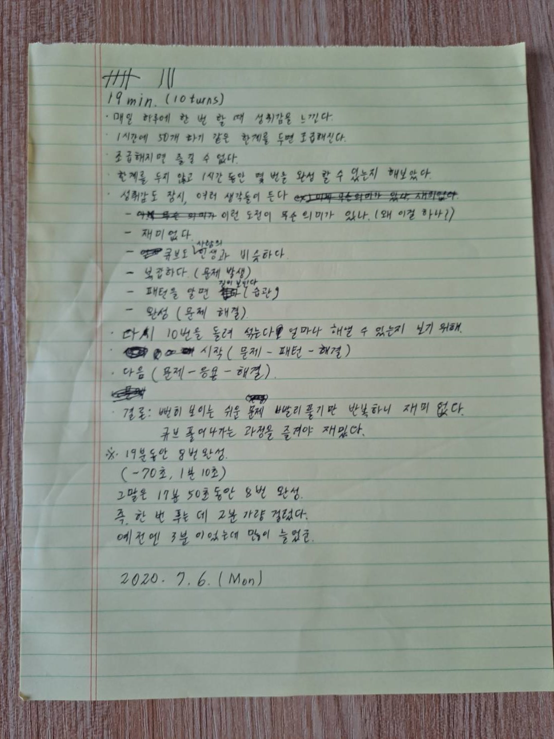 기록한 메모지를 보니 한창 큐브에 집중하던 시기였습니다.