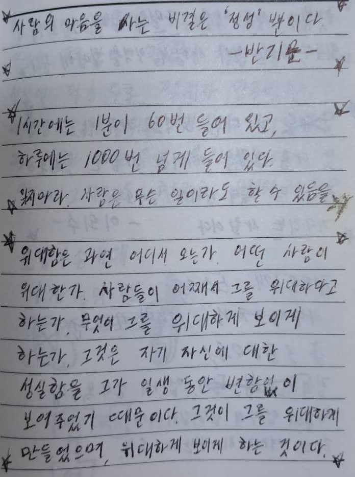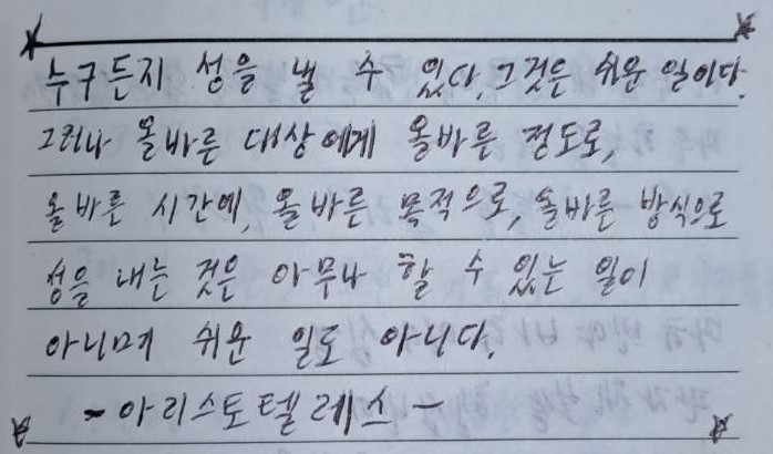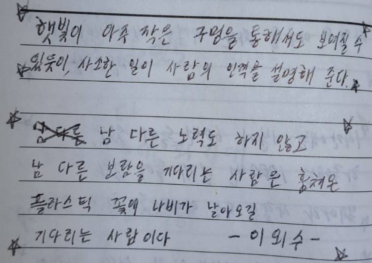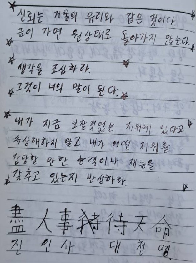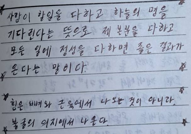 이 글이 반가웠던 이유는, 제가 군대 훈련소에서 이 글귀를 보고 노트에 적은 적이 있었기 때문입니다.