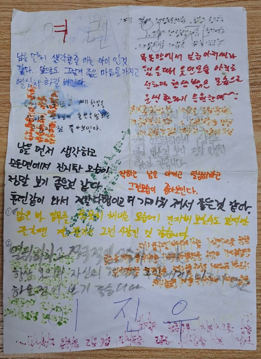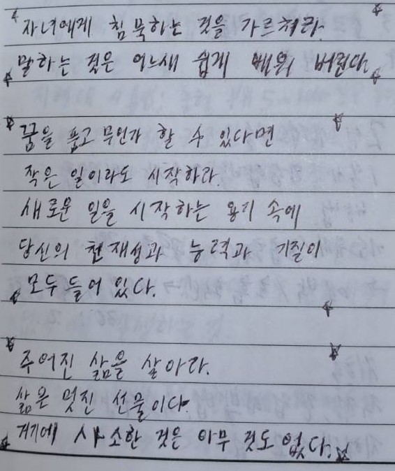 논산 육군훈련소에서 훈련 후 할 것이 없어서 생활관에 비치되어 있던 '좋은 생각' 같은 책을 읽고, 마음에 드는 글들을 메모했었습니다.